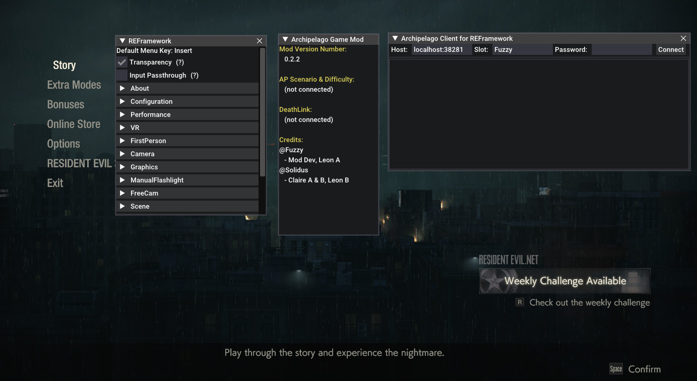 If you see both a "REFramework" and a couple of "Archipelago" windows in-game, the install worked!