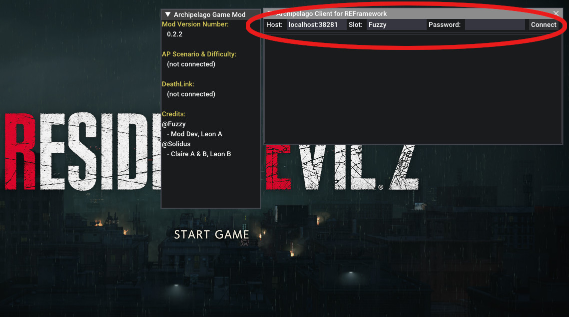 In the "Archipelago Client for REFramework" window in your game, enter the connection details for your multiworld.